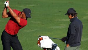 The younger Woods was spotted giving his pops some swing help on the range before Sunday’s round.